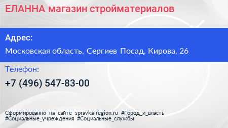 ЕЛАННА, магазин стройматериалов по адресу Московская область, Сергиев Посад, Кирова, 26 в дальнейшем Организация, размещена в следующих категориях: