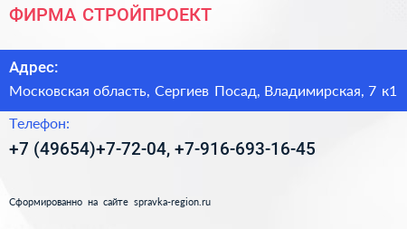 ФИРМА СТРОЙПРОЕКТ по адресу Московская область, Сергиев Посад, Владимирская, 7 к1 в дальнейшем Организация, размещена в следующих категориях: