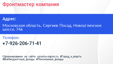 Фронтмастер, компания по адресу Московская область, Сергиев Посад, Новоугличское шоссе, 74в в дальнейшем Организация, размещена в следующих категориях: