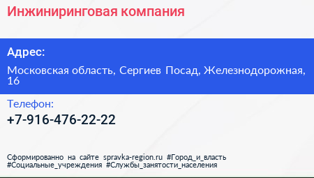 Инжиниринговая компания по адресу Московская область, Сергиев Посад, Железнодорожная, 16 в дальнейшем Организация, размещена в следующих категориях: