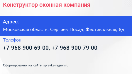 Конструктор, оконная компания по адресу Московская область, Сергиев Посад, Фестивальная, 8д в дальнейшем Организация, размещена в следующих категориях: