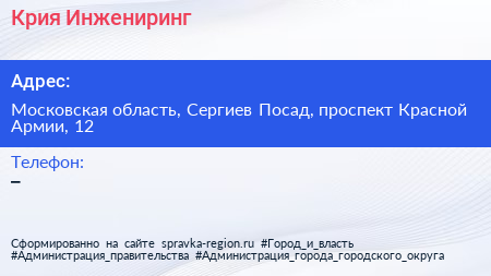 Крия Инжениринг по адресу Московская область, Сергиев Посад, проспект Красной Армии, 12 в дальнейшем Организация, размещена в следующих категориях: