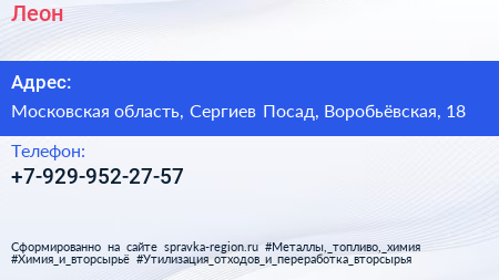 Леон по адресу Московская область, Сергиев Посад, Воробьёвская, 18 в дальнейшем Организация, размещена в следующих категориях: