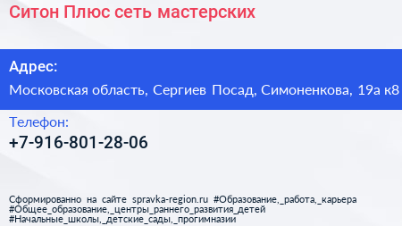 Ситон Плюс, сеть мастерских по адресу Московская область, Сергиев Посад, Симоненкова, 19а к8 в дальнейшем Организация, размещена в следующих категориях: