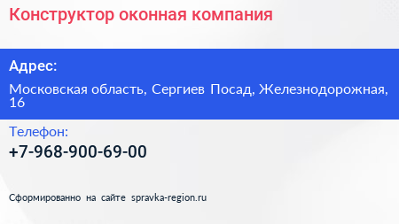 Конструктор, оконная компания по адресу Московская область, Сергиев Посад, Железнодорожная, 16 в дальнейшем Организация, размещена в следующих категориях: