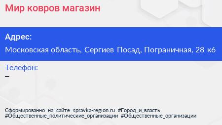 Мир ковров, магазин по адресу Московская область, Сергиев Посад, Пограничная, 28 к6 в дальнейшем Организация, размещена в следующих категориях: