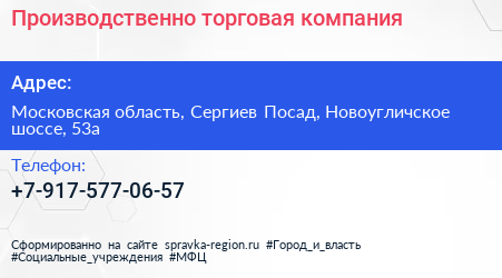 Производственно-торговая компания по адресу Московская область, Сергиев Посад, Новоугличское шоссе, 53а в дальнейшем Организация, размещена в следующих категориях: