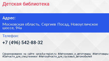 Детская библиотека по адресу Московская область, Сергиев Посад, Новоугличское шоссе, 94а в дальнейшем Организация, размещена в следующих категориях: