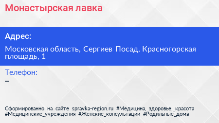 Монастырская лавка по адресу Московская область, Сергиев Посад, Красногорская площадь, 1 в дальнейшем Организация, размещена в следующих категориях: