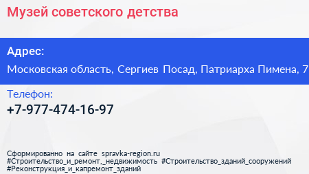 Музей советского детства по адресу Московская область, Сергиев Посад, Патриарха Пимена, 7 в дальнейшем Организация, размещена в следующих категориях: