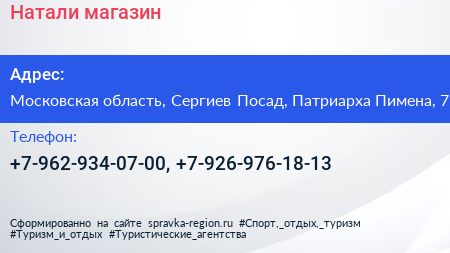 Натали, магазин по адресу Московская область, Сергиев Посад, Патриарха Пимена, 7 в дальнейшем Организация, размещена в следующих категориях: