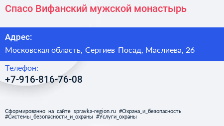 Спасо-Вифанский мужской монастырь по адресу Московская область, Сергиев Посад, Маслиева, 26 в дальнейшем Организация, размещена в следующих категориях: