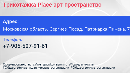 Трикотажка Place, арт-пространство по адресу Московская область, Сергиев Посад, Патриарха Пимена, 7 в дальнейшем Организация, размещена в следующих категориях: