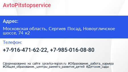AvtoPitstopservice по адресу Московская область, Сергиев Посад, Новоугличское шоссе, 74 к2 в дальнейшем Организация, размещена в следующих категориях: