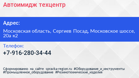 Автоимидж, техцентр по адресу Московская область, Сергиев Посад, Московское шоссе, 20а к2 в дальнейшем Организация, размещена в следующих категориях: