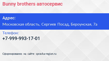 Bunny brothers, автосервис по адресу Московская область, Сергиев Посад, Бероунская, 7а в дальнейшем Организация, размещена в следующих категориях: