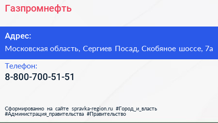 Газпромнефть по адресу Московская область, Сергиев Посад, Скобяное шоссе, 7а в дальнейшем Организация, размещена в следующих категориях: