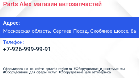 Parts Alex, магазин автозапчастей по адресу Московская область, Сергиев Посад, Скобяное шоссе, 8а в дальнейшем Организация, размещена в следующих категориях: