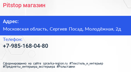 Pitstop, магазин по адресу Московская область, Сергиев Посад, Молодёжная, 2д в дальнейшем Организация, размещена в следующих категориях:
