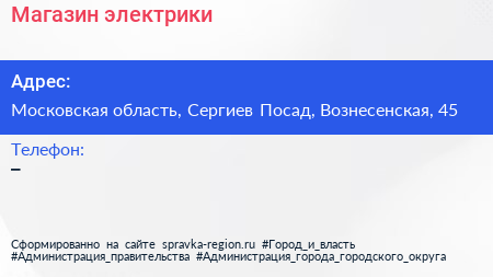 Магазин электрики по адресу Московская область, Сергиев Посад, Вознесенская, 45 в дальнейшем Организация, размещена в следующих категориях: