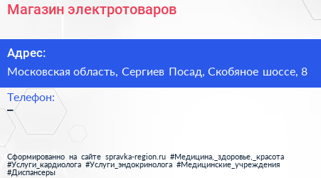 Магазин электротоваров по адресу Московская область, Сергиев Посад, Скобяное шоссе, 8 в дальнейшем Организация, размещена в следующих категориях: