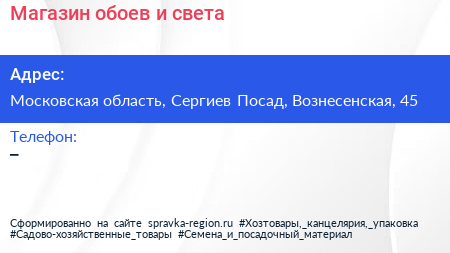 Магазин обоев и света по адресу Московская область, Сергиев Посад, Вознесенская, 45 в дальнейшем Организация, размещена в следующих категориях: