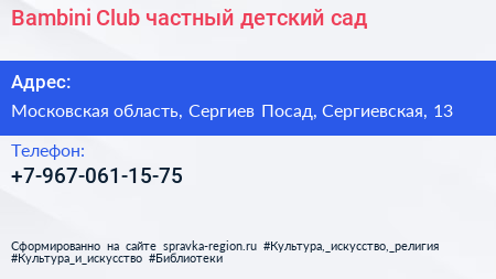 Bambini-Club, частный детский сад по адресу Московская область, Сергиев Посад, Сергиевская, 13 в дальнейшем Организация, размещена в следующих категориях:
