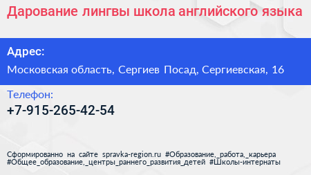 Дарование лингвы, школа английского языка по адресу Московская область, Сергиев Посад, Сергиевская, 16 в дальнейшем Организация, размещена в следующих категориях: