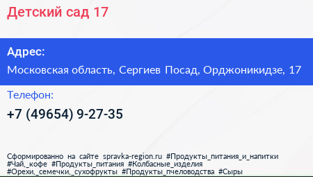 Детский сад №17 по адресу Московская область, Сергиев Посад, Орджоникидзе, 17 в дальнейшем Организация, размещена в следующих категориях: