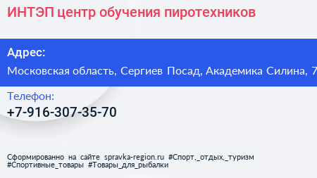 ИНТЭП, центр обучения пиротехников по адресу Московская область, Сергиев Посад, Академика Силина, 7 в дальнейшем Организация, размещена в следующих категориях: