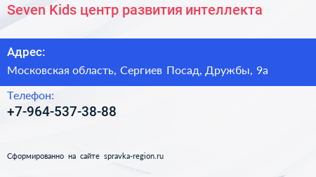 Seven Kids, центр развития интеллекта по адресу Московская область, Сергиев Посад, Дружбы, 9а в дальнейшем Организация, размещена в следующих категориях: