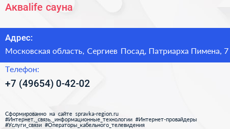 Акваlife, сауна по адресу Московская область, Сергиев Посад, Патриарха Пимена, 7 в дальнейшем Организация, размещена в следующих категориях: