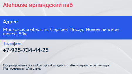 Alehouse, ирландский паб по адресу Московская область, Сергиев Посад, Новоугличское шоссе, 53а в дальнейшем Организация, размещена в следующих категориях: