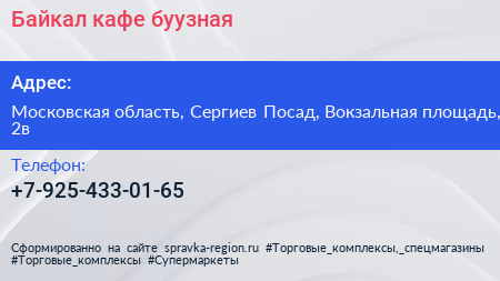 Байкал, кафе-буузная по адресу Московская область, Сергиев Посад, Вокзальная площадь, 2в в дальнейшем Организация, размещена в следующих категориях: