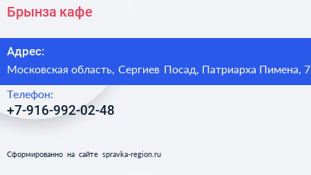 Брынза, кафе по адресу Московская область, Сергиев Посад, Патриарха Пимена, 7 в дальнейшем Организация, размещена в следующих категориях:
