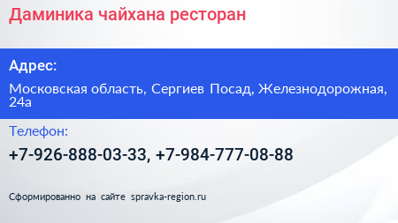 Даминика, чайхана-ресторан по адресу Московская область, Сергиев Посад, Железнодорожная, 24а в дальнейшем Организация, размещена в следующих категориях: