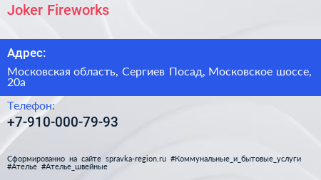 Joker Fireworks по адресу Московская область, Сергиев Посад, Московское шоссе, 20а в дальнейшем Организация, размещена в следующих категориях: