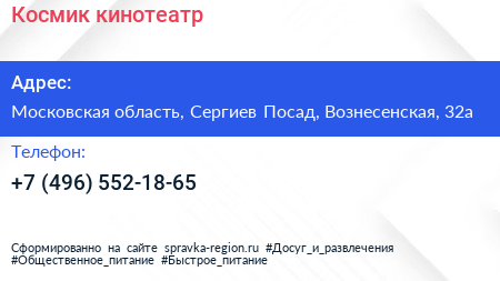Космик, кинотеатр по адресу Московская область, Сергиев Посад, Вознесенская, 32а в дальнейшем Организация, размещена в следующих категориях: