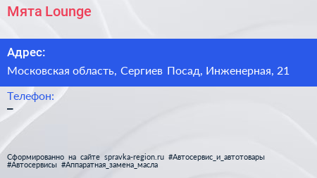 Мята Lounge по адресу Московская область, Сергиев Посад, Инженерная, 21 в дальнейшем Организация, размещена в следующих категориях: