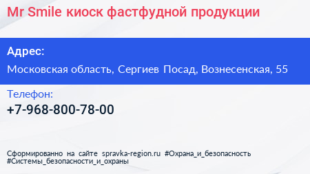 Mr. Smile, киоск фастфудной продукции по адресу Московская область, Сергиев Посад, Вознесенская, 55 в дальнейшем Организация, размещена в следующих категориях: