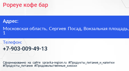 Popeye, кофе-бар по адресу Московская область, Сергиев Посад, Вокзальная площадь, 1 в дальнейшем Организация, размещена в следующих категориях: