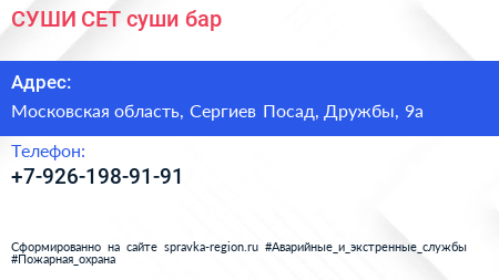 СУШИ СЕТ, суши-бар по адресу Московская область, Сергиев Посад, Дружбы, 9а в дальнейшем Организация, размещена в следующих категориях: