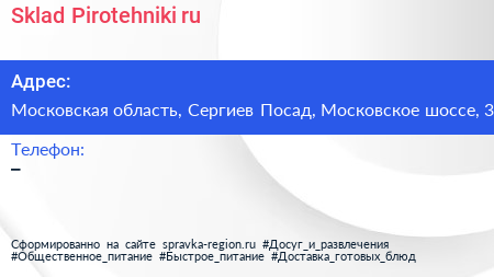 Sklad-Pirotehniki.ru по адресу Московская область, Сергиев Посад, Московское шоссе, 3 в дальнейшем Организация, размещена в следующих категориях: