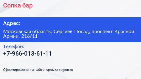 Сопка, бар по адресу Московская область, Сергиев Посад, проспект Красной Армии, 216/11 в дальнейшем Организация, размещена в следующих категориях: