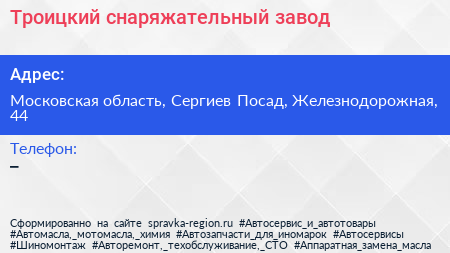Троицкий снаряжательный завод по адресу Московская область, Сергиев Посад, Железнодорожная, 44 в дальнейшем Организация, размещена в следующих категориях: