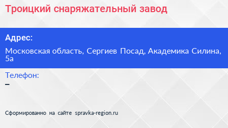 Троицкий снаряжательный завод по адресу Московская область, Сергиев Посад, Академика Силина, 5а в дальнейшем Организация, размещена в следующих категориях: