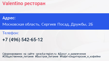 Valentino, ресторан по адресу Московская область, Сергиев Посад, Дружбы, 2Б в дальнейшем Организация, размещена в следующих категориях: