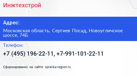 Инжтехстрой по адресу Московская область, Сергиев Посад, Новоугличское шоссе, 74Б в дальнейшем Организация, размещена в следующих категориях: