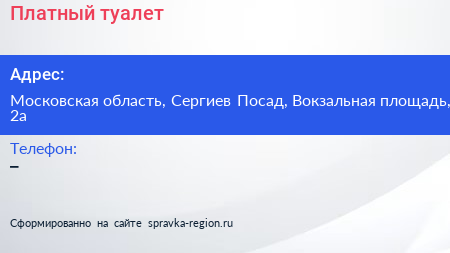 Платный туалет по адресу Московская область, Сергиев Посад, Вокзальная площадь, 2а в дальнейшем Организация, размещена в следующих категориях: