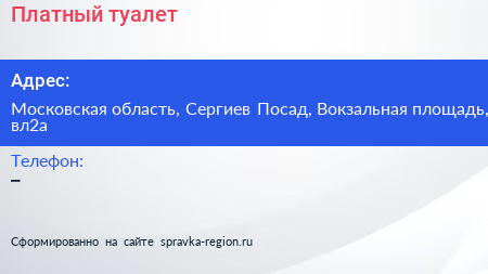 Платный туалет по адресу Московская область, Сергиев Посад, Вокзальная площадь, вл2а в дальнейшем Организация, размещена в следующих категориях: